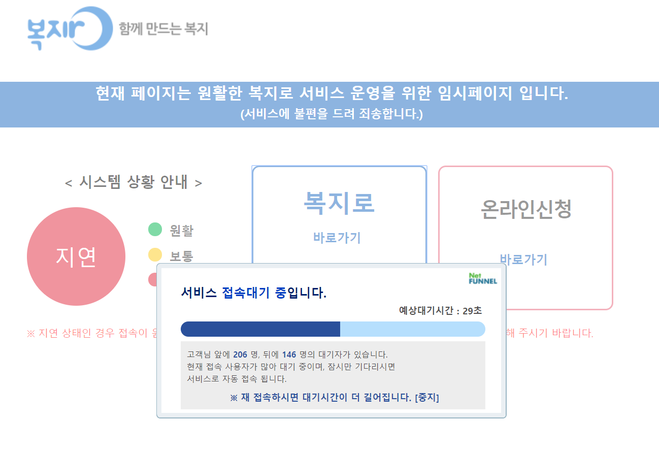 복지로 사이트 들어가시면 접속신호등이 뜨면서 시스템 상황을 안내해줍니다. 파란불이면 접속이 원활하고 노란불이면 접속이 원활, 빨간불이면 지연을 뜻하는데 저는 새벽 4시에 복지로에 접속했는데도 지연입니다. 제 접속앞에 몇명이 있고 제 뒤에 몇명이 있는지랑 예상대기시간이 나옵니다. 저는 제 앞에 약 206명이 있었을 때 약 1~2분정도 대기후 접속이 가능했습니다. 그리 기다리는 시간이 걸리지 않고 금방 접속이 가능해서 그나마 수월했습니다.