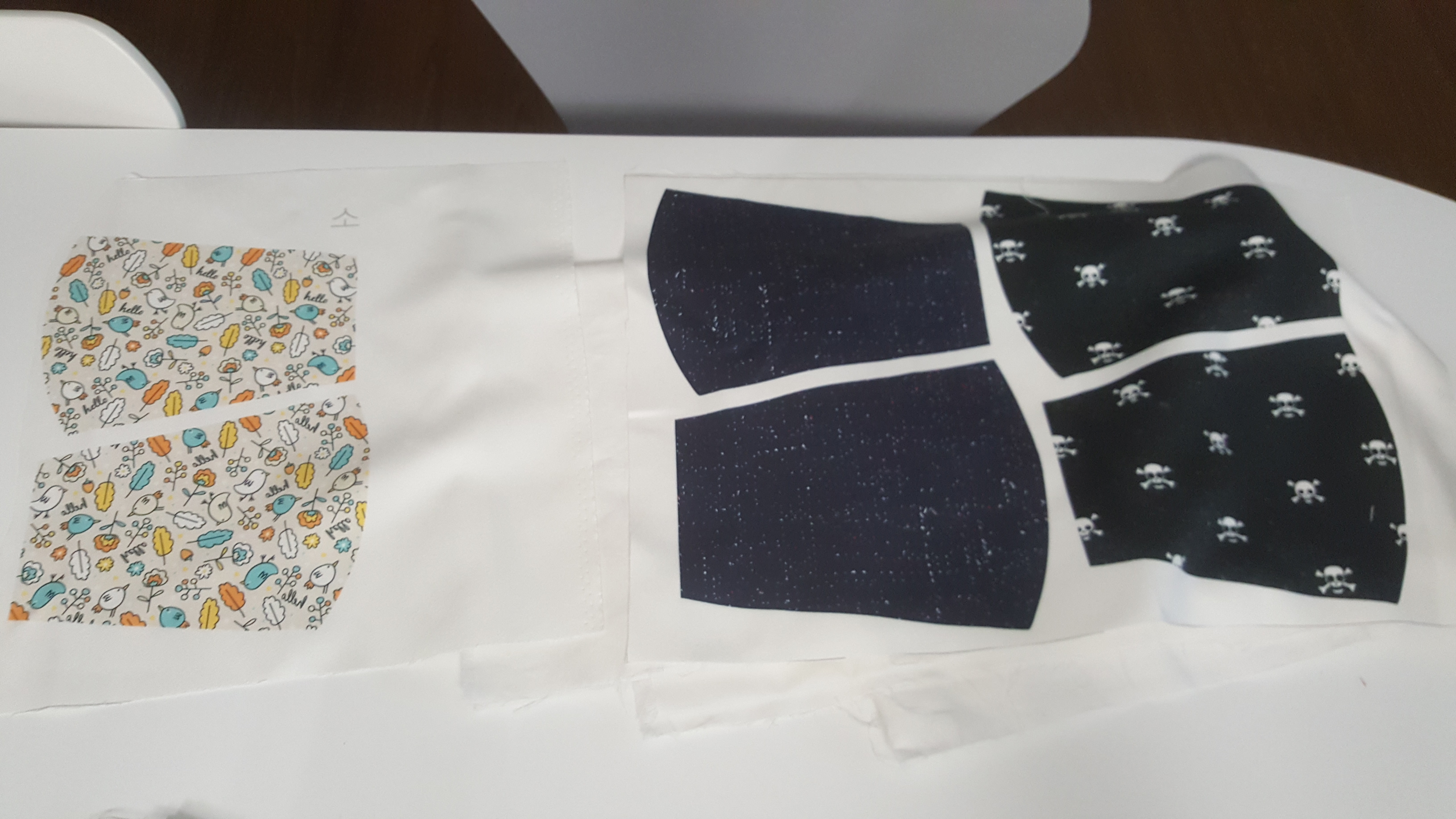 아이용 면마스크입니다. 저 모양대로 하시면 별로 입니다.제가 가지고 있는 일회용마스크를 본떠 천을 다시 재단하였습니다.다행히 저 천 안에서 가능하더라구요