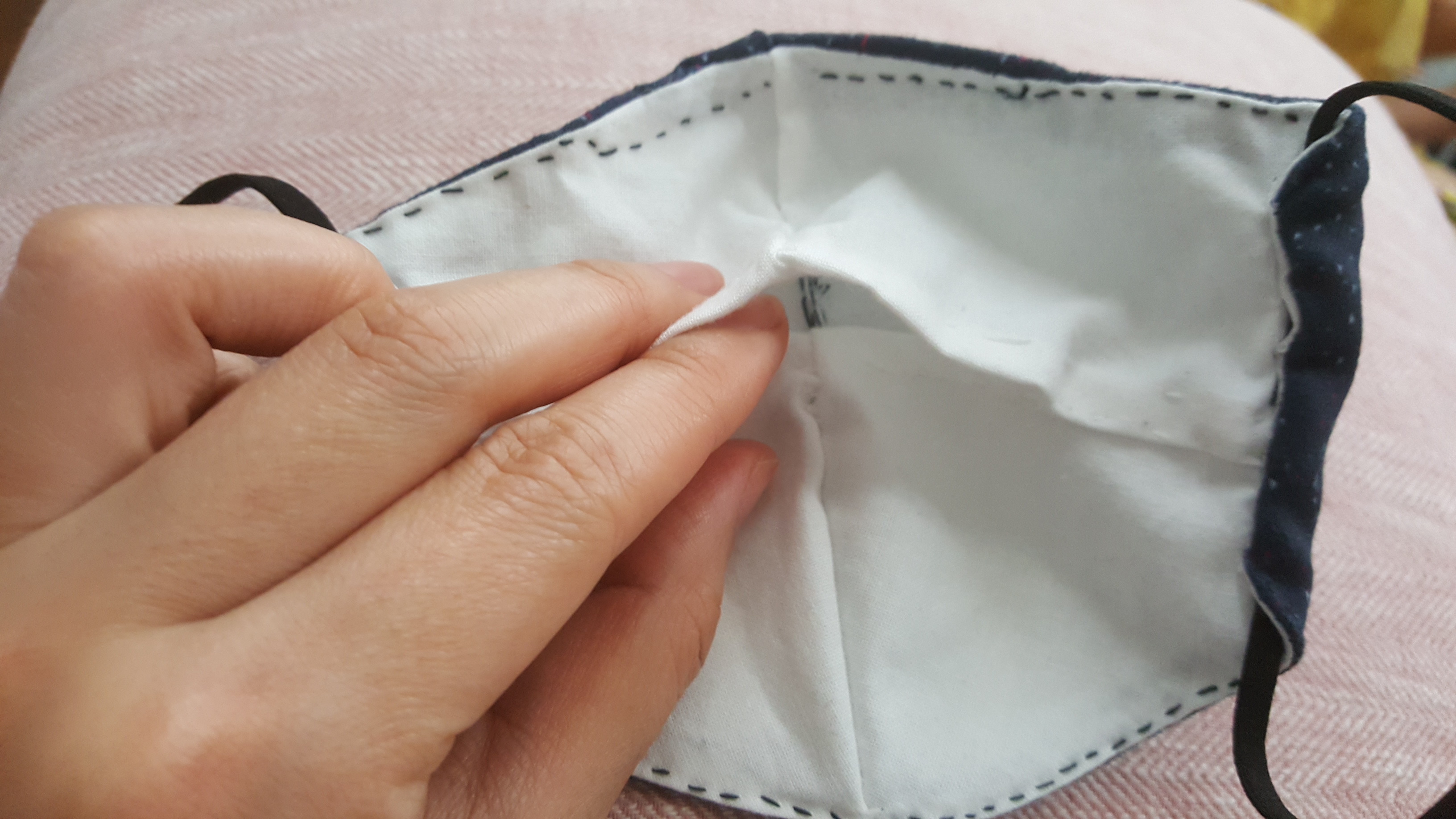3. 완성한 마스크에 데두리부분을 시침질하며 코쪽 부분에 와이어 넣고 시침질.
