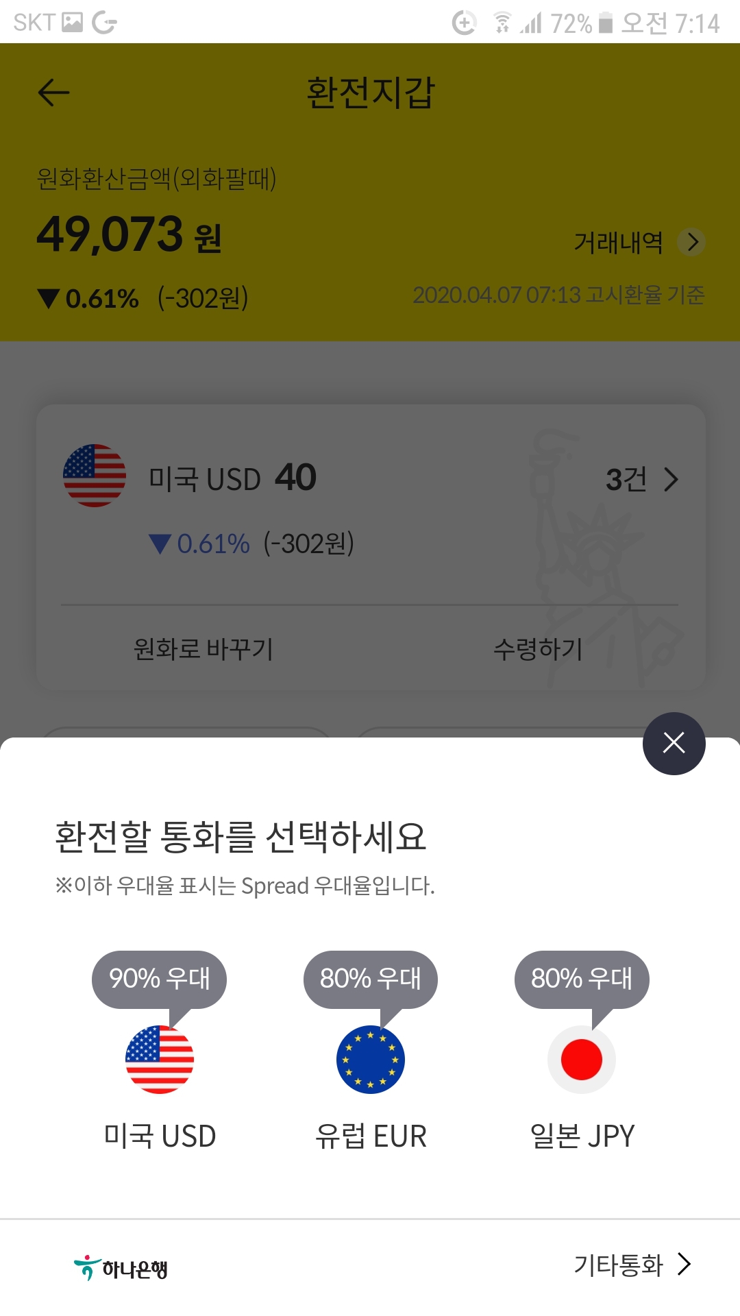 환전지갑이 나오는 화면에는 현재 환전지갑에 있는 통화가 보이고 거래내역을 확인할 수도 있고 원화로 바꾸는 재환전과 수령하기 등의 메뉴가 있습니다. 원하는 메뉴를 여기서 찾아 하시면 됩니다. 저는 환전을 진행하고자 하므로 환전하기를 누릅니다. 그러면 다음과 같이 환전할 통화를 고르는 창이 뜹니다. 달러는 90%우대중이고 유로와 엔화는 80$우대중입니다. 기타 베트남등의 통화등의 환전을 원하시면 아래 기타통화를 누르고 들어가시면 됩니다.